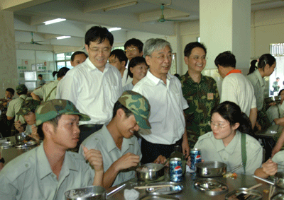 章校長等校領(lǐng)導在部隊領(lǐng)導的陪同下走訪了學生宿舍和飯?zhí)谩A私鈱W生起居飲食,殷切詢問學生的生活和學習情況。