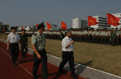 軍訓二團2000多名大一新生在廣州武警指揮學院進行軍訓。校領(lǐng)導檢閱九個連的學員。學員們精神抖擻,軍姿威武,用響亮的回答來迎接檢閱。