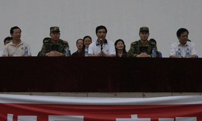 陶士平與部隊首長檢閱了同學們的軍訓成果。他代表學校對三團的老師和學生致以深切慰問,對預備役防化團的首長和教官表示衷心感謝。陶士平指出,大學生軍訓是國家的要求,是加強國防意識的要求,是保證強有力后備軍的要求。中國人民解放軍是一所特殊的大學,它以“政治合格、軍事過硬、作風優(yōu)良、保障有力”而聞名。通過軍訓能使同學們學到基本軍事知識,以及中國人民解放軍艱苦奮斗、堅韌不拔的優(yōu)良作風。他希望同學們以飽滿的熱情投身到軍訓當中,不怕苦,不怕累,服從教官,團結(jié)互助,關(guān)愛他人。通過這次軍訓能夠?qū)W習政治,學習待人處事,學會生活。陶士平說,軍訓是大學的第一課,同學們必須認真上好這一課,學習發(fā)揚軍隊的優(yōu)良作風,圓滿完成軍訓任務。最后,他祝同學們投身熔爐,百煉成鋼。