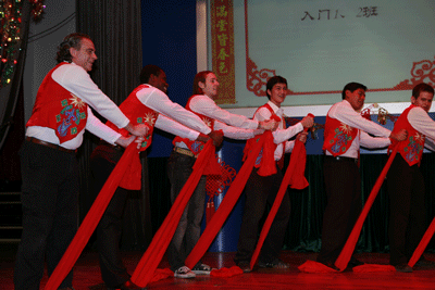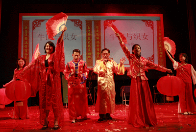 文藝匯演在入門一、二班表演的《纖夫的愛》中拉開了帷幕,學生們燦爛的笑容、歡快的舞步特別是兩位“土耳其媒婆”出色的表演,贏得在場的觀眾陣陣熱烈掌聲。在商務班《牛郎與織女》中,演員們運用不同的方式來闡釋留學生對留學生活的細致觀察,情節緊湊、語言生動。來自剛果的學生福蘭克表演了節奏感十足的街舞,伴隨著強勁的音樂翻滾、倒立、彈跳,喝彩叫好聲不絕于耳。中級一班自編自演的話劇《國王的新衣》,演員分別來自俄羅斯、韓國、日本、印尼、巴西、土耳其、菲律賓等十個國家,別出心裁,特別是兩位來自捷克和美國的“金發騙子”精湛的演技以及他們和“加拿大國王”生動的對手戲,生動別致的情節設置、詼諧的對話,給現場的觀眾留下了深刻印象,把整場演出的歡樂氣氛推向高潮,現場成了歡樂的海洋。