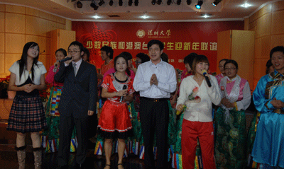 晚會由校黨委統戰部部長李永華主持。江潭瑜在聯誼會上致辭――“和諧是福,團結就是力量”。他說,中國是個多民族的國家,深圳是多民族的城市,我校是多民族學生一起就讀的學校,我校現有29個民族的學生,其中有少數民族學生400多名,還有港澳臺僑學生200多名。我們雖有著不同的生活習俗和不同的語言,但是在中國共產黨下的“和而不同”的環境下的“大和”,國家富強,民族團結。我們共同走過了光輝的2007年,還要共同走進更加燦爛的2008年。2008年全世界的目光都注視著我們,青年人肩負著振興中華的重任,讓我們攜手共同奮進!