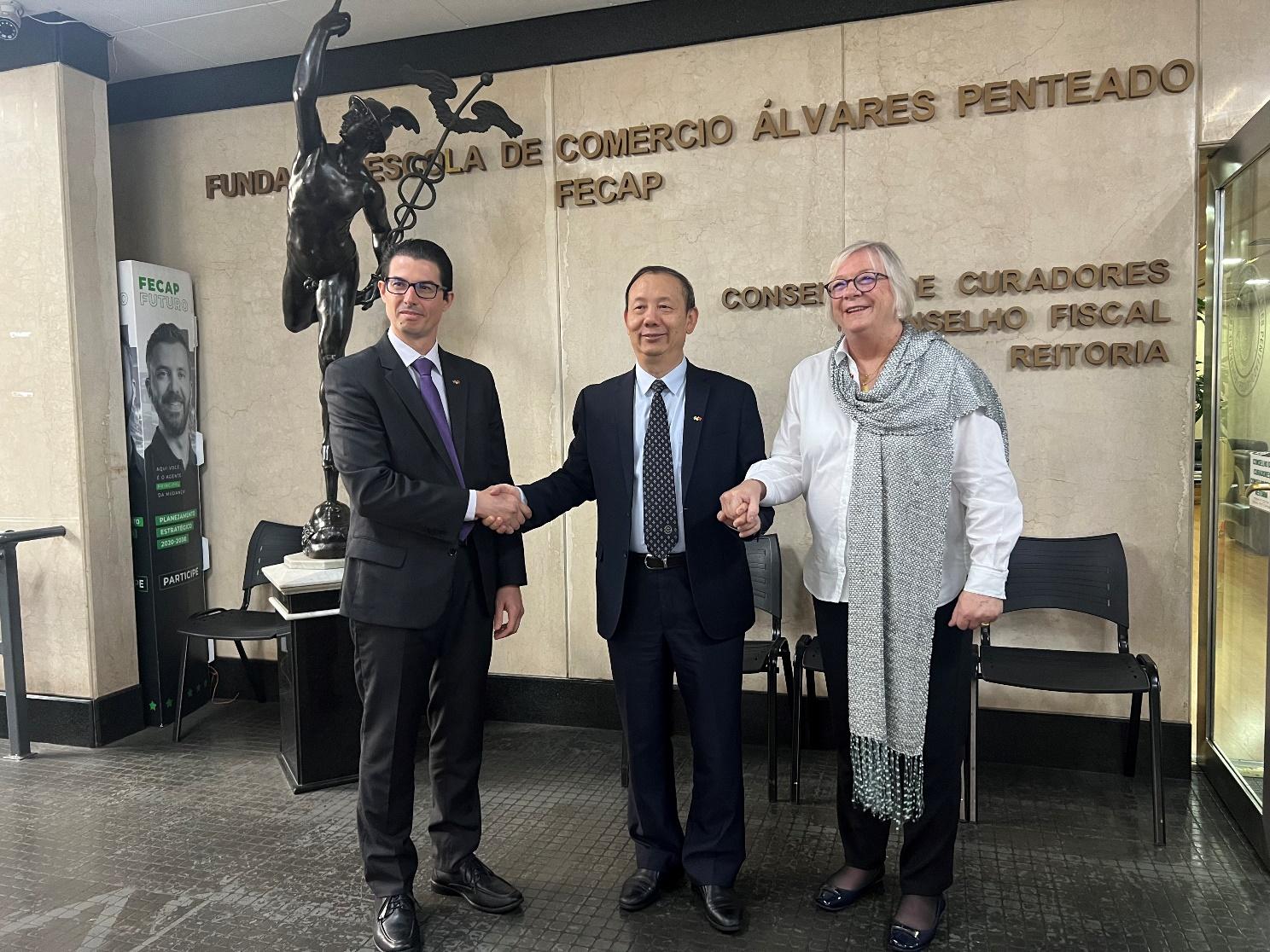 作為深圳南特金融科技學(xué)院聯(lián)合管理委員會主任,毛軍發(fā)還與法國南特高等商學(xué)院負(fù)責(zé)人一道訪問了南特高等商學(xué)院在巴西的合作伙伴院校巴西阿爾瓦雷斯·本蒂亞多商學(xué)院(FECAP)和丹·卡布瑞爾商學(xué)院(FDC),舉行了聯(lián)合管理委員會會議,并就南特金融科技學(xué)院與兩所商科院校的合作達(dá)成協(xié)議。
