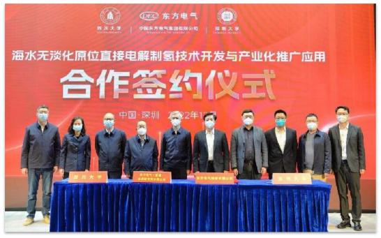 2022年12月16日,四川大學、深圳大學中國工程院院士謝和平海水制氫團隊與東方電氣股份有限公司、東福研究院簽署四方合作協議