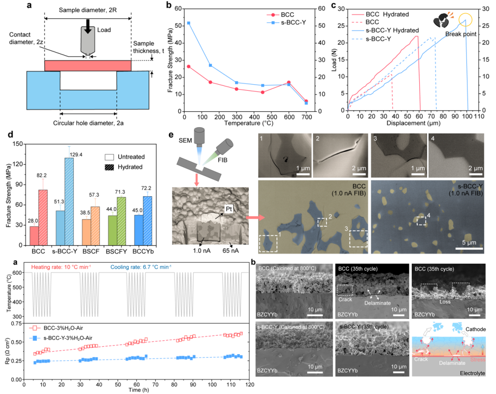 水合誘導強化實驗結果表明:該策略能夠有效強化電極材料的斷裂強度、模量等關鍵力學性能,且具有極好普適性(見圖3)!以經典的空氣電極材料體系Ba(Ce,Co)O3為例,相比未改性電極材料,水合強化后的電極(命名為s-BCC-Y)機械力學性能大幅增強,斷裂強度提升了86%,達129.4 MPa,在600至300攝氏度之間劇烈熱循環35次后,s-BCC-Y無明顯電化學性能損失和材料降解,仍保持穩定。