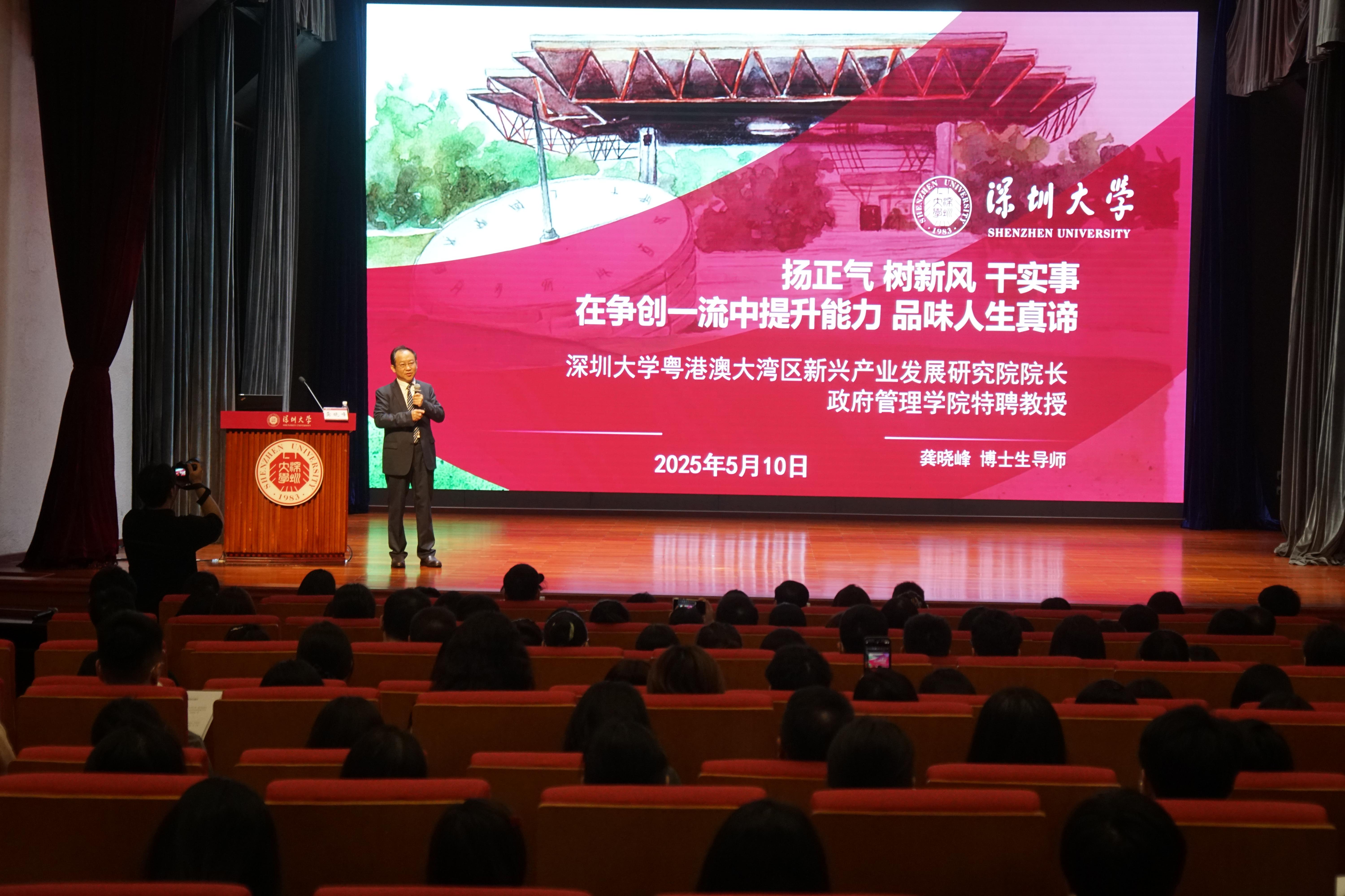 深圳大學粵港澳大灣區新興產業發展研究院院長、政府管理學院特聘教授龔曉峰以“揚正氣、樹新風、干實事,在爭創一流中提升能力,品味人生真諦”為題作專題講座。他結合個人豐富的工作與學習經歷,深入探討了新質生產力背景下對青年干部綜合素質的新要求,并圍繞管理人員如何增強本領、培養領導力以及提升個人軟實力等方面展開詳細講述。講座中,龔曉峰金句頻出,生動詼諧,用鮮活的案例闡釋理論,使內容更加貼近實際,現場不時爆發出陣陣掌聲。他鼓勵年輕干部們敢于做夢、勇于追夢、善于圓夢,以積極進取的姿態迎接挑戰,為學校爭創一流目標貢獻智慧與力量。