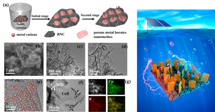 在過(guò)去的十年,構(gòu)建二維過(guò)渡金屬納米片已經(jīng)成為制備高效電催化材料的有效手段。尤其是僅有原子厚度的超薄納米片具備較大的比表面積、較高的表面/體積比,使得表面原子達(dá)到最大的暴露。因此,超薄的納米片在氧析出反應(yīng)中普遍具有優(yōu)異的電催化活性。但是,超薄納米片的橫向質(zhì)量擴(kuò)散能力較差,使得其活性難以進(jìn)一步提高。與之形成鮮明對(duì)比的是,超薄的納米網(wǎng)狀材料不僅完美地繼承了超薄納米片的優(yōu)勢(shì),而且具備規(guī)則的多孔結(jié)構(gòu),可以極大地促進(jìn)電催化過(guò)程中的傳質(zhì),從而提高納米片狀材料的電催化活性。但是,大多數(shù)的過(guò)渡金屬納米網(wǎng)都是使用硬模板的方法合成,具有合成過(guò)程繁瑣的缺點(diǎn)。因此,開發(fā)簡(jiǎn)單、有效的方法來(lái)合成超薄的過(guò)渡金屬納米網(wǎng)并進(jìn)一步研究其在電催化反應(yīng)中的獨(dú)特優(yōu)勢(shì),是十分有意義的。最近,深圳大學(xué)化學(xué)與環(huán)境工程學(xué)院何傳新教授課題組介紹了一種利用三維樹皮狀氮摻雜碳為納米反應(yīng)器來(lái)合成超薄金屬硼酸鹽納米網(wǎng)的通用方法,并將所制備的金屬納米網(wǎng)用于完全電解水,研究了超薄納米片組成的網(wǎng)絡(luò)結(jié)構(gòu)在電催化反應(yīng)中的獨(dú)特優(yōu)勢(shì)。