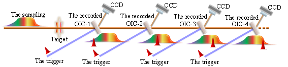 圖1成像系統的原理圖。采樣脈沖(The sampling)照射目標物體,經過4個光學成像轉換器(OIC),即非共線光參量放大器。當泵浦光脈沖(標記為“Trigger”)入射OPA時,產生閑頻光(標記為“Recorded”)。在泵浦光脈沖之間引入延遲,可以通過使用傳統的CCD相機拍攝閑頻光來獲取時序多幅圖像。