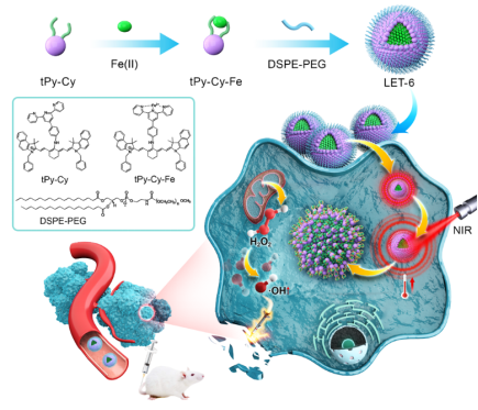 該團(tuán)隊(duì)首先合成了有機(jī)吡啶配體修飾花菁類分子(tPy-Cy),然后利用吡啶與Fe2+強(qiáng)的配位作用,從而保持其離子價(jià)態(tài),避免其氧化。再利用納米沉淀法,將螯合Fe2+的tPy-Cy與DSPE-PEG制備成粒徑均一的納米顆粒(LET-6)。在808 nm激光照射下,光熱作用導(dǎo)致LET-6變形并解體,釋放Fe2+,從而觸發(fā)CDT。該Fe2+遞送系統(tǒng)在細(xì)胞水平和動(dòng)物水平,均展現(xiàn)出優(yōu)異的治療效果。在動(dòng)物水平,僅一次治療,荷瘤小鼠的腫瘤完全消除。這種光刺激響應(yīng)的可變形Fe2+遞送系統(tǒng)在腫瘤診療中具有潛在臨床應(yīng)用前景。