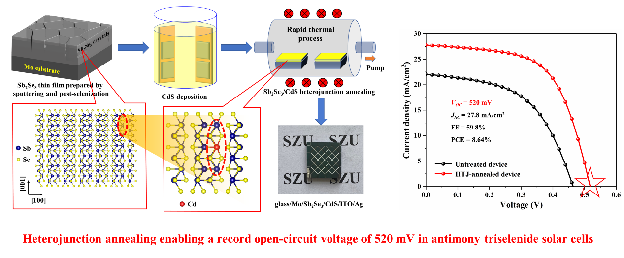近日,深圳大學(xué)物理與光電工程學(xué)院范平教授團(tuán)隊(duì)梁廣興研究員在新型硒化銻薄膜太陽電池研究中獲得重要進(jìn)展,在國際材料和物理應(yīng)用領(lǐng)域頂級期刊Advanced Materials(影響因子:32.086)上發(fā)表了題為“Heterojunction Annealing Enabling Record Open-Circuit Voltage in Antimony Triselenide Solar Cells”的研究論文。該論文采用與產(chǎn)業(yè)兼容性高的真空濺射結(jié)合硒化熱處理生長高質(zhì)量光吸收層Sb2Se3薄膜并構(gòu)建Mo/ Sb2Se3/CdS/ITO/Ag平面異質(zhì)結(jié)薄膜太陽電池,對Sb2Se3/CdS異質(zhì)結(jié)進(jìn)行快速熱處理,實(shí)現(xiàn)元素有益擴(kuò)散,材料摻雜濃度明顯提高、優(yōu)化Spike-like能帶匹配、有效鈍化界面缺陷和非輻射復(fù)合得到抑制,最終硒化銻薄膜太陽電池開路電壓突破500 mV至520 mV且光電轉(zhuǎn)化效率提升至8.64%。梁廣興研究員為論文的通訊作者,唐戎副研究員和陳爍副研究員為論文的共同第一作者,深圳大學(xué)為唯一通訊單位。
