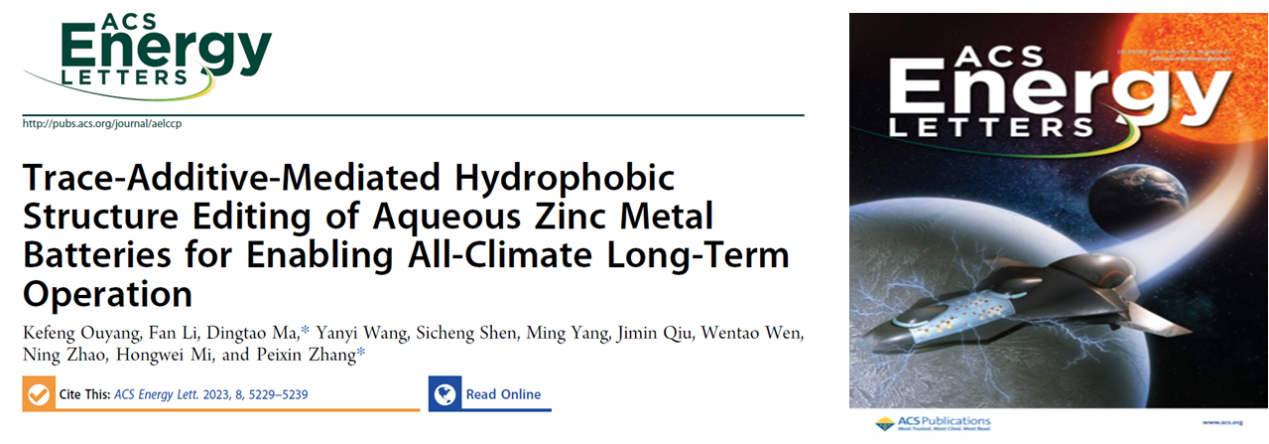 4.為解決Zn2+傳輸動(dòng)力學(xué)緩慢和電解質(zhì)界面熱力學(xué)不穩(wěn)定等問(wèn)題,提出了痕量添加劑介導(dǎo)的疏水結(jié)構(gòu)編輯概念,通過(guò)向水系電解液中添加聚丙烯酸(PAA)來(lái)重建電解液Zn2+溶劑化結(jié)構(gòu)并實(shí)現(xiàn)電極-電解液界面原位自組裝。重構(gòu)的Zn2+水合結(jié)構(gòu)具有快速的電化學(xué)反應(yīng)動(dòng)力學(xué),而電極表面界面層極大提高了水系鋅金屬電池體系的熱力學(xué)穩(wěn)定性,從而實(shí)現(xiàn)了寬溫域的長(zhǎng)期運(yùn)行。該成果作為封面文章發(fā)表在《ACS Energy Letters 》(2023,8:5229)。深圳大學(xué)為第一完成單位和唯一通訊單位,研究生歐陽(yáng)珂豐和李帆為論文第一作者,張培新教授和馬定濤副研究員為共同通訊作者。論文鏈接:http://10.1021/acsenergylett.3c01872