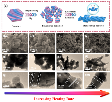 在金屬催化劑中構(gòu)建孿晶界,已經(jīng)成為提升其電催化性能的有效手段之一。目前孿晶的構(gòu)建主要依賴于表面活性劑輔助的液相合成法,但是大多數(shù)表面活性劑存在長(zhǎng)烷基鏈,導(dǎo)致納米晶體放入表面被表面活性劑所包裹,極大地阻礙了活性位點(diǎn)的暴露以及電催化過(guò)程中的電荷轉(zhuǎn)移。因此,我們提出了一種無(wú)表面活性劑的孿晶催化材料合成策略,利用氫氣氣氛下超薄氧化銅納米片的快速升溫還原,合成具有多級(jí)孿晶界的銅基催化材料。通過(guò)原位透射電鏡追蹤了孿晶的形成過(guò)程,發(fā)現(xiàn)快速的升溫以及超薄氧化物納米片的亞穩(wěn)態(tài)特性,可以使氧化物銅在焙燒過(guò)程中發(fā)生不同方向的碎裂形成大量的晶核,從而通過(guò)晶核的碰撞以及合并誘導(dǎo)非常規(guī)的晶體生長(zhǎng)方式,最終形成多級(jí)孿晶結(jié)構(gòu)。將多級(jí)孿晶銅用于硝酸根還原反應(yīng),發(fā)現(xiàn)其催化活性遠(yuǎn)高于單取向的孿晶以及無(wú)孿晶的銅基催化材料。通過(guò)一系列的電化學(xué)以及理論計(jì)算,作者發(fā)現(xiàn)多級(jí)孿晶的結(jié)構(gòu)會(huì)產(chǎn)生壓縮應(yīng)變,從而形成孿晶與壓縮應(yīng)變的協(xié)同效應(yīng),降低硝酸根還原為氨的反應(yīng)能壘并抑制副產(chǎn)物生成。