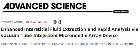 近日,深圳大學醫學部生物醫學工程學院張學記教授、蘇磊教授團隊在Wiley期刊Advanced Science(影響因子15.1,中科院一區,TOP期刊)上發表了題為“Enhanced Interstitial Fluid Extraction and Rapid Analysis via Vacuum Tube-Integrated Microneedle Array Device”的研究論文。醫學部博士后謝媛婷為第一作者,張學記教授、蘇磊教授為共同通訊作者,深圳大學為第一作者單位和通訊單位。