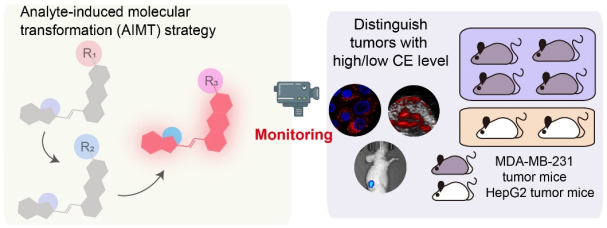 同時,該團隊的另一項研究《Carboxylesterase Activatable Molecular Probe for Personalized Treatment Guidance by Analyte-Induced Molecular Transformation》也于近期發表在《Angew. Chem. Int. Ed.》上。該工作提出了分析物誘導分子轉變(AIMT)策略,借助羧酸酯酶(CE)激活的半花菁分子探針,實現活體近紅外FL/PA雙模態成像實時監測CE水平。在小動物盲篩實驗中,成功區分高CE水平的肝癌腫瘤(HepG2)和低CE水平的乳腺癌腫瘤(MDA-MB-231)。該工作為指導腫瘤個性化治療決策提供了一種新思路。深圳大學醫學部研究助理李本浩(現為新加坡國立大學博士后)和博士研究生劉恒克為第一作者,新加坡國立大學陳小元教授和深圳大學林靜教授為通訊作者,深圳大學為第一完成和通訊作者單位。