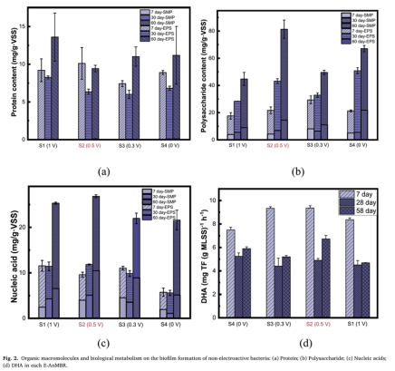 通過SEM觀察非電活性菌的生物膜形成情況,生物膜厚度在350 ~ 800 μm之間(圖S7)。與S4中的生物膜(468 μm)相比,發(fā)現(xiàn)過低(0.3 V)和過高(1 V)的電場電壓都阻礙了非電活性細(xì)菌在膜表面的生物膜生長。0.5 V電場(S2)顯著提高了非電活性細(xì)菌的生物膜厚度(780 um),達到S4的1.6倍。此外,S2 (0.5 V)較高的zeta電位絕對值(31.6 mV, p < 0.01)也進一步支持了這一點(圖S8)。由此可見,電場顯著調(diào)節(jié)非電活性細(xì)菌生物膜的發(fā)育,而0.5 V電場則明顯刺激非電活性細(xì)菌在膜表面的形成。進一步的研究發(fā)現(xiàn),較低的PN/PS被認(rèn)為增加了非電活性細(xì)菌在膜上不可逆的生物膜形成。從圖2(a)和(b)可以直觀地看出,PN/PS值為S1 (1 V)> S3 (0.3 V)> 54 (0 V)> S2 (0.5 V),S3 (0.3 V)和S1 (1 V)使PN/PS值高于S4,而S2 (0.5 V)使其降低。這一結(jié)果與S2的生物膜最厚的觀察結(jié)果相一致。在0.5 V電場作用下,核酸最高(26.8 mg/g VsS, p < 0.01)。同時,S2的生物膜越厚,其核酸含量也可能越高。這一結(jié)果解釋了為什么0.5 V電場會加劇由于非電活性細(xì)菌生物膜在膜表面形成的不可逆性污染。此外,S2的高脫氫酶活性(DHA)含量(9.36 mg/g VSS, p < 0.01)也支持了這一結(jié)論(圖d)。在生物處理過程中,高DHA產(chǎn)生更多的代謝廢物,從而導(dǎo)致非電活性細(xì)菌形成更嚴(yán)重的生物膜。與S4相比,S2的DHA含量增加,而S3和S1的DHA含量則受到抑制。因此,0.5 V電場可以促進非電活性細(xì)菌的生物膜形成,并積聚在膜表面。