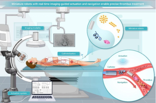 圖3.微型機器人驅動與成像系統引導下的大腦深部血栓治療示意圖。