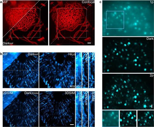 圖2.交叉驗證證明Dark sectioning技術的保真性能。(a)霉菌樣本的寬場-共聚焦成像,(b)小鼠腎臟微絲的多模態結構光照明顯微成像,(c)小鼠神經元鈣成像的單光子-雙光子成像。比例尺:(a, b)4 μm。