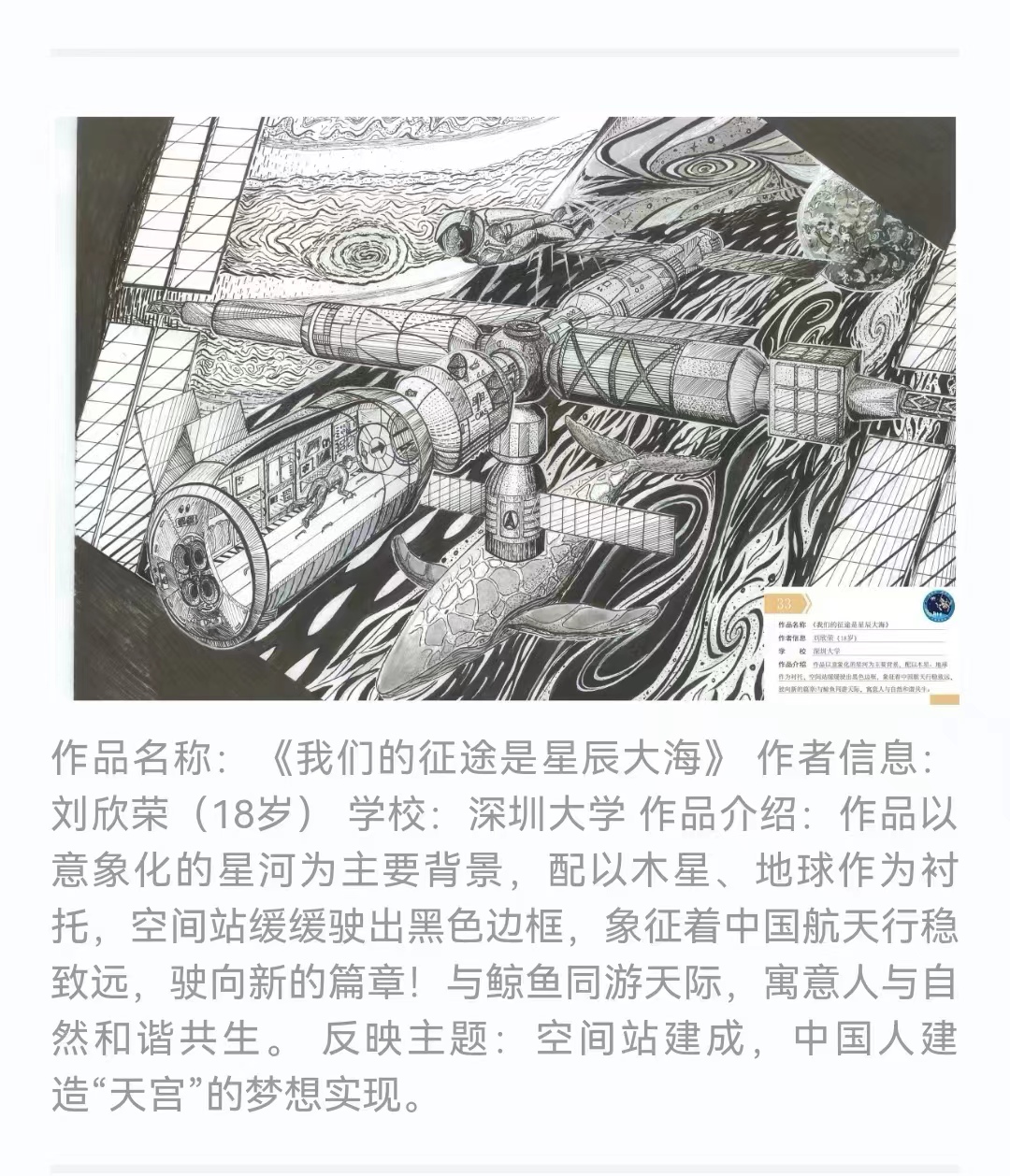 2023年1月21日,除夕萬家團圓之際,第二屆“天宮畫展”在中國空間站正式開展。共有來自全國17個省(市、區)和香港、澳門特別行政區的40幅青少年繪畫作品亮相“天宮”。深圳大學管理學院2022級工商管理專業學生劉欣榮的作品《我們的征途是星辰大海》入選其中。