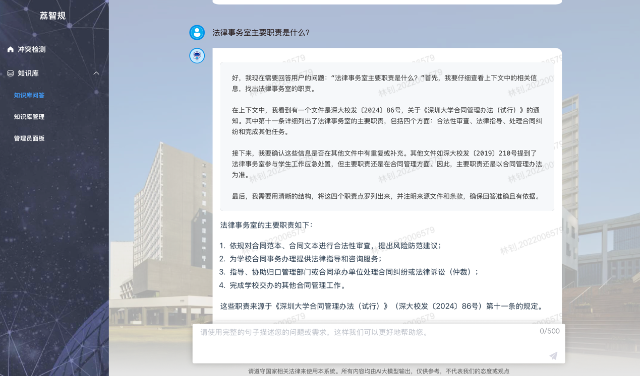 該系統基于大語言模型能力,具備制度智能問答與制度沖突檢測兩大核心功能,為師生提供高效、準確、智能的規章制度服務,標志著深圳大學在智慧校園與制度治理數字化建設方面邁出重要一步。